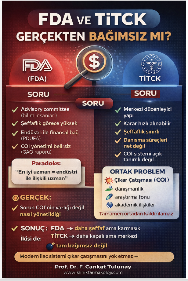 Sonuç olarak: FDA veya TİTCK tamamen bağımsız kurumlar değildir. Sorun bireysel hatalardan çok systemin yapısındadır ve çıkar çatışması da bu systemin bir parçasıdır. Çıkar çatışması sistematik olarak halk sağlığını bozar.