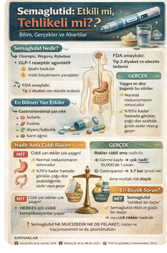 Tüm bu veriler birlikte değerlendirildiğinde, semaglutid etkili ancak yan etkisiz olmayan bir ilaçtır. Gastrointestinal yan etkiler yaygın, ciddi komplikasyonlar ise nadirdir. NAION için kanıtlar çelişkilidir, tiroid kanseri için şimdilik net bir nedensellik yoktur ve pankreatit açısından büyük çalışmalar genel olarak güven vericidir. Bugün karşı karşıya olduğumuz temel sorun, ilacın kendisinden çok, onun etrafında oluşan anlatıdır. Bilimsel gerçek, pazarlama ve hukuk söylemleri arasında sıkışmış durumdadır. Bu nedenle en doğru yaklaşım, ne bu ilaçları “mucize” olarak görmek ne de “tehlikeli felaket” olarak damgalamaktır. Klinik kararlar bireysel risk-yarar dengesi temelinde verilmelidir. Semaglutid ne mucizedir ne de felaket. Sorun, gerçeğin iki farklı çıkar grubu tarafından farklı şekillerde eğilip bükülmesidir.