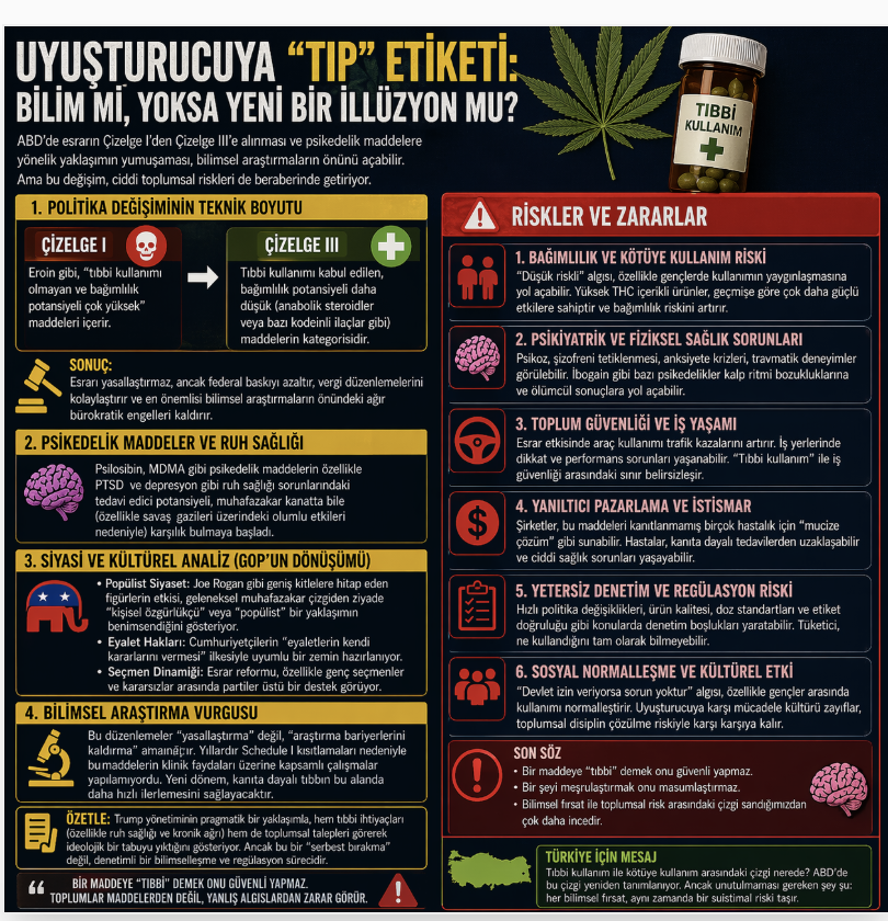 ABD’de uyuşturucu politikalarına yönelik son değişiklikler, yüzeyde teknik gibi görünse de aslında tıp, siyaset ve toplum sağlığını aynı anda etkileyen derin bir paradigma değişimini işaret ediyor. Özellikle esrarın Çizelge I’den Çizelge III’e alınması, yalnızca hukuki bir düzenleme değil; aynı zamanda onlarca yıldır süren “uyuşturucuya karşı savaş” anlayışının kırılması anlamına geliyor. Bu değişim çoğu zaman “bilimsel araştırmaların önünü açma” söylemiyle sunuluyor. Ancak burada kritik bir soru ortaya çıkıyor: gerçekten amaç bilim mi, yoksa bilim üzerinden yeni bir meşrulaştırma süreci mi başlatılıyor?