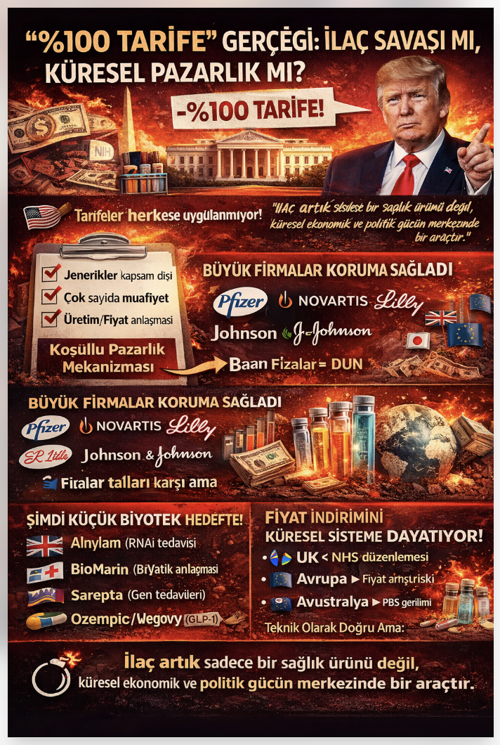 Sonuç olarak “%100 tarife” ifadesi teknik olarak doğru olsa da gerçeği tam olarak yansıtmaz. Daha doğru tanım şudur: bu sistem, seçici, koşullu ve pazarlık temelli bir ilaç ticaret rejimidir. Büyük şirketler bu sistem içinde anlaşma yaparak kendilerini koruyabilirken, daha küçük firmalar çok daha ciddi bir baskı altında kalmaktadır. Bu süreç başarılı olursa ABD yalnızca kendi fiyatlarını değil, küresel ilaç fiyat mimarisini değiştirebilir. Başarısız olursa ise daha pahalı ilaçlar, daha kırılgan tedarik zincirleri ve daha politize bir ilaç piyasası ortaya çıkabilir.