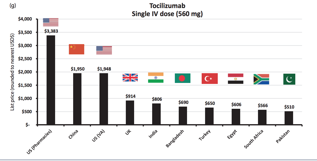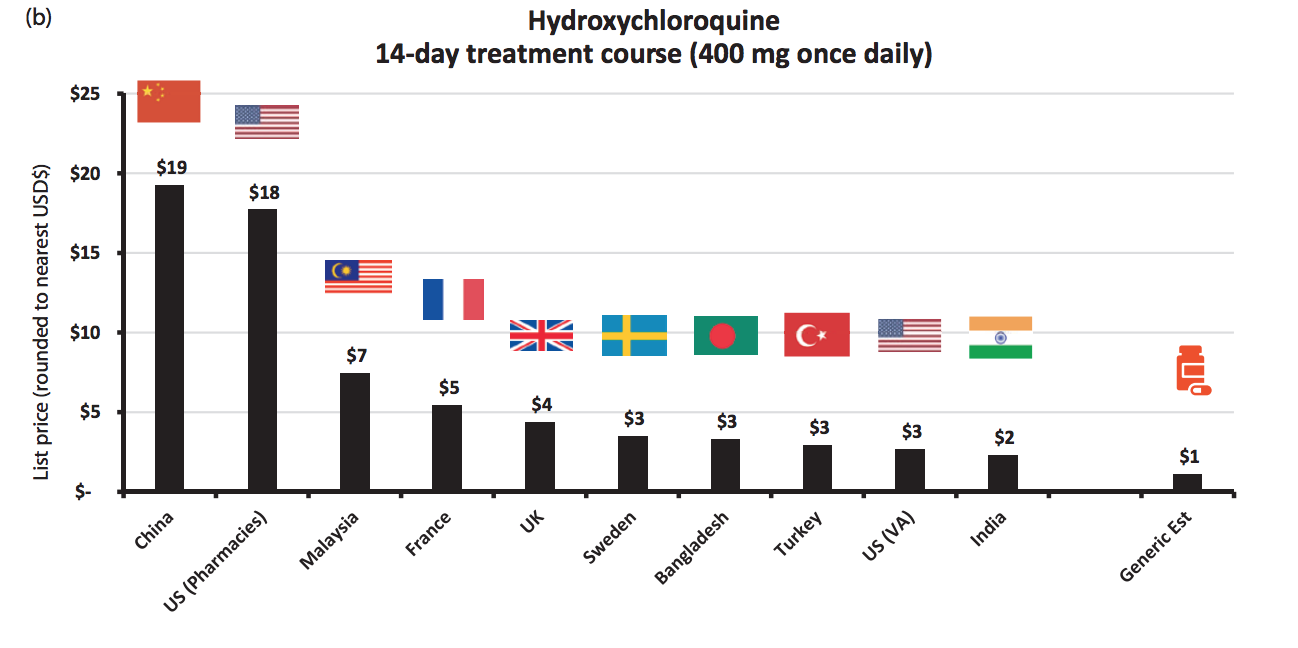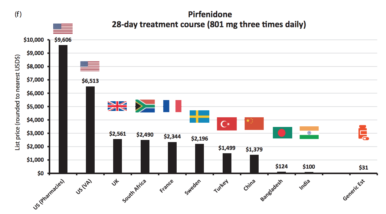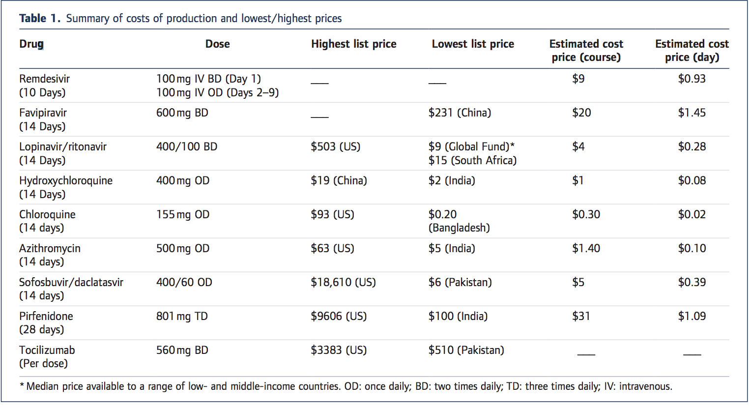 Sonuçlar: Minimum tahmini üretim maliyetleri remdesivir için 0.93 $ / gün, favipiravir için 1.45 $ / gün, hidroksiklorokin için 0.08 $ / gün, klorokin için 0.02 $ / gün, azitromisin için 0.10 $ / gün, lopinavir / ritonavir için 0.02 $ / gün, 0.39 $ / gün sofosbuvir / daclatasvir için ve pirfenidon için 1.09 $ / gün. Üretim maliyetleri tedavi süresi başına (10-28 gün) 0.30 $ ile 31 $ arasında değişmektedir. Bu ilaçların mevcut fiyatları, özellikle ABD'de, üretim maliyetlerinden çok daha yüksekti.