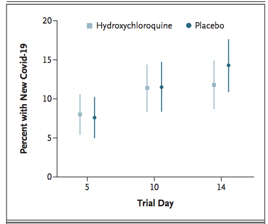 Araştırmaya 821 asemptomatik kişi katıldı. Genel olarak, katılımcıların% 87,6'sı (821'in 719'u) onaylanmış bir Covid-19 temasına yüksek riskli maruz kaldığını bildirmiştir. Covid-19 ile uyumlu yeni hastalık insidansı, hidroksiklorokin alan katılımcılar (414'ün 49'u [% 11.8]) ile plasebo alan katılımcılar (407'nin 58'i [% 14.3]) arasında anlamlı farklılık göstermemiştir. Yan etkiler, hidroksiklorokin ile plasebodan (% 40.1'e karşı% 16.8) daha yaygındı, ancak ciddi advers reaksiyonlar rapor edilmedi.