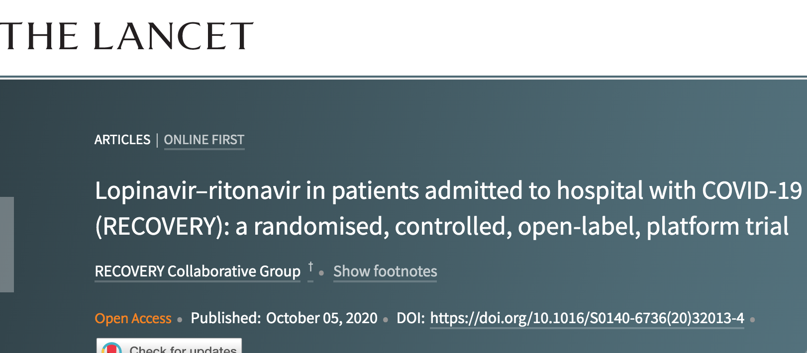 Covid-19 sebebi ile hastaneye yatan hastalara uygulanan lopinavir-ritonavir tedavisi yapılan 11.867 hasta üzerinde yapılan randomize plasebo kontrollü RECOVERY çalışmasında etkisiz bulundu.