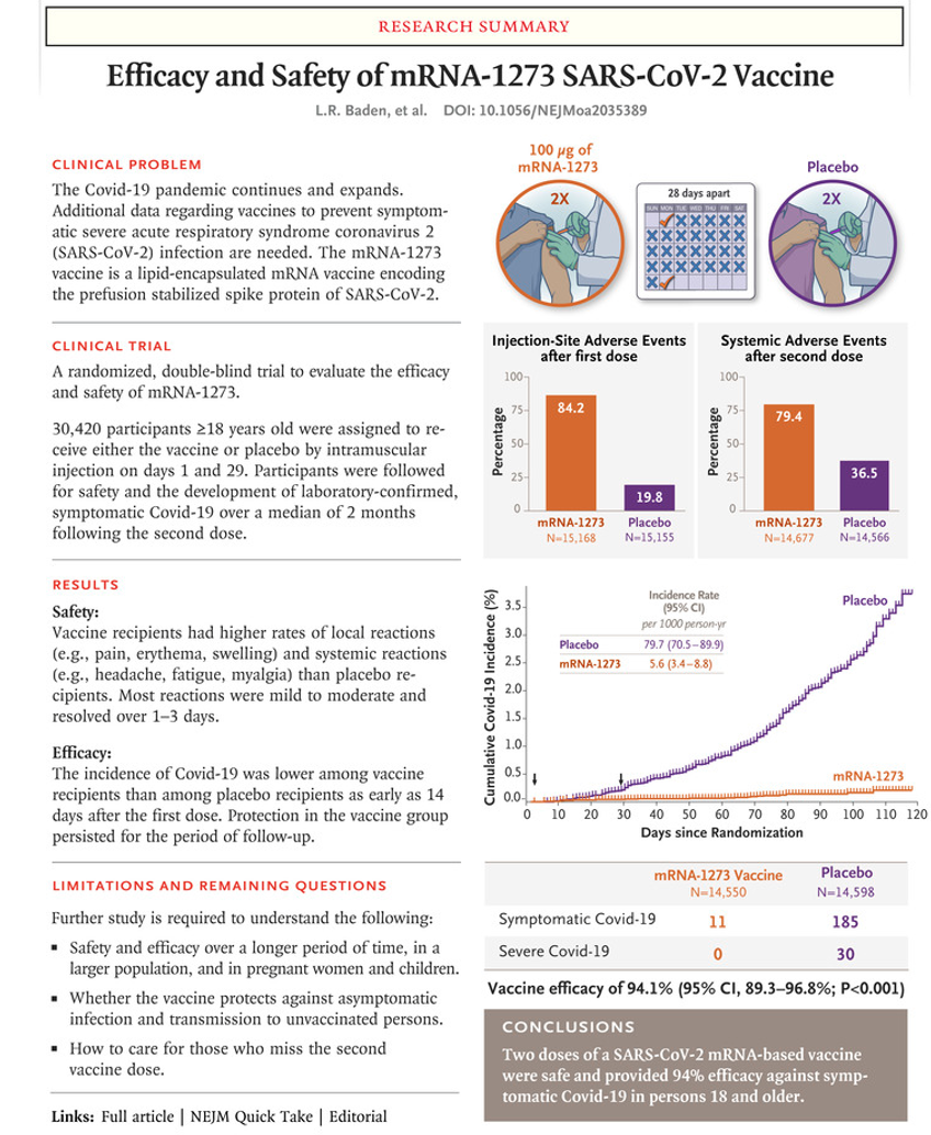 Semptomatik Covid-19 hastalığı, plasebo grubundaki 185 katılımcıda (1000 kişi-yılı başına 56,5;% 95 güven aralığı [CI], 48,7 ila 65,3) ve mRNA-1273 grubundaki 11 katılımcıda (1000 kişide 3,3- yıl;% 95 GA, 1,7 - 6,0) tesbit edildi. Aşı etkinliği% 94.1 (% 95 CI,% 89.3 ila% 96.8; P <0.001) bulundu. 65 yaş ve üstü katılımcılarda analizler: Plasebo grubunda 30 katılımcıda birisi ölümle sonuçlanan şiddetli Covid-19 meydana geldi. Aşılamadan sonra orta, geçici reaktojenite mRNA-1273 grubunda daha sık meydana geldi. Ciddi yan etkiler nadirdi ve insidans iki grupta benzerdi.