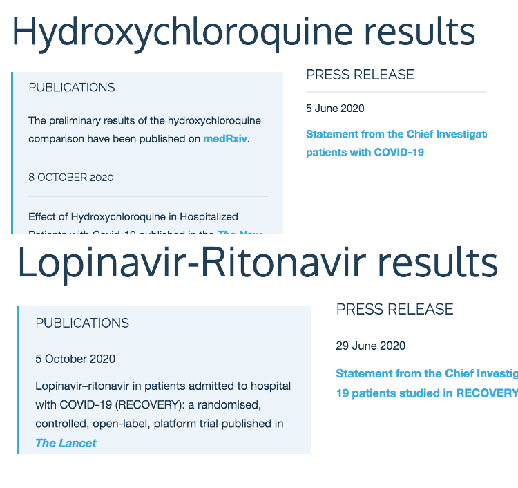 4716 Hasta üzerinde yapılan büyük RECOVERY araştırması sonuçlarına göre HCQ Covid-19 tedavisinde etkisiz. HCQ grubunda 28 günlük tedavi sırasında ölüm %27.0, semptomatik tedavi yapılanlarda %25. Hastaneden canlı olarak taburcu edilen hasta oranı HCQ grubunda %59.6, standart tedavi (semptomatik) grubunda %62.9.Mekanik ventilasyon uygulanmayan hastalarda invazif ventilasyona ihtiyaç duyulması ve ölüm HCQ grubunda %30.7, HQC kullanılmayan hastalarda %26.9.